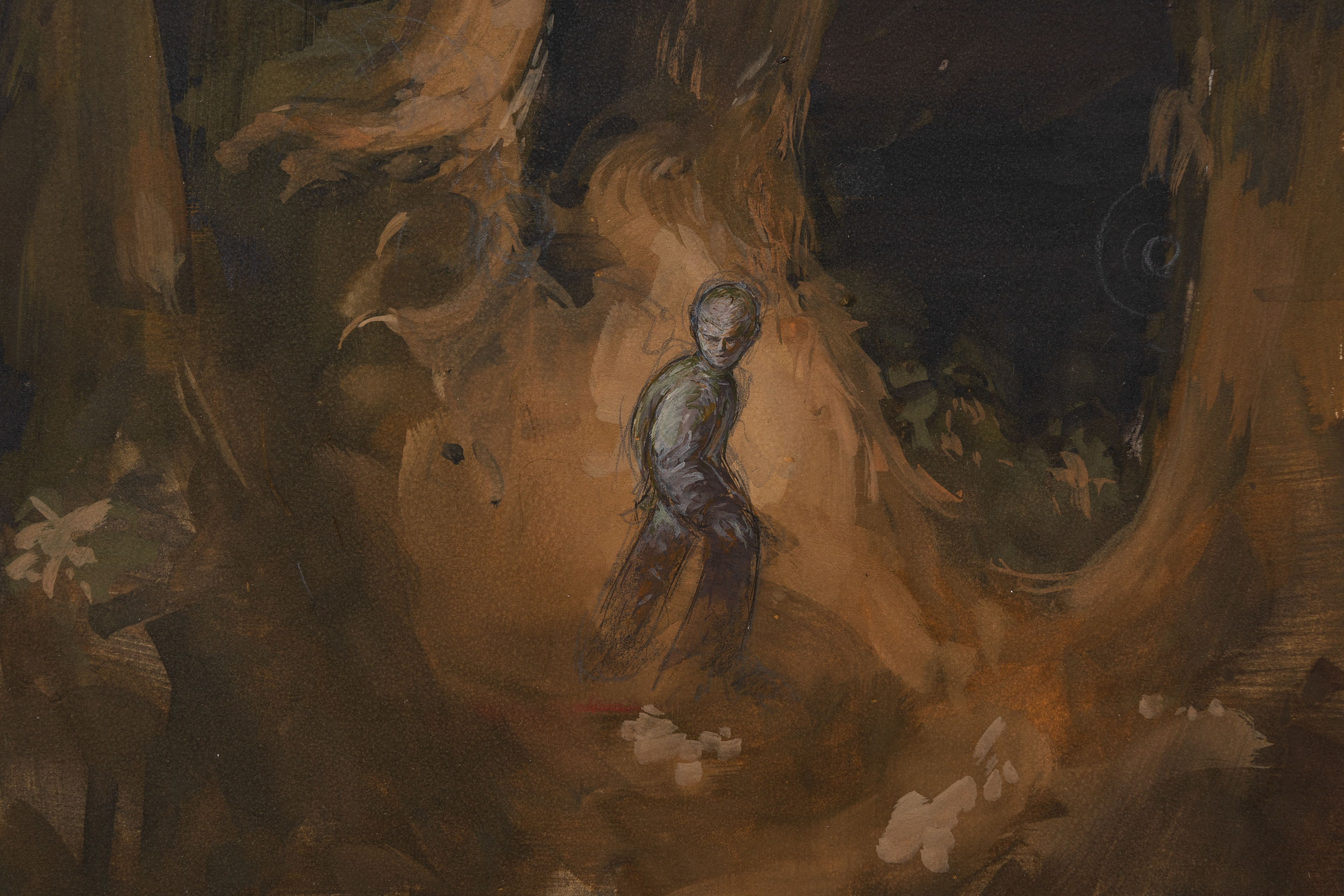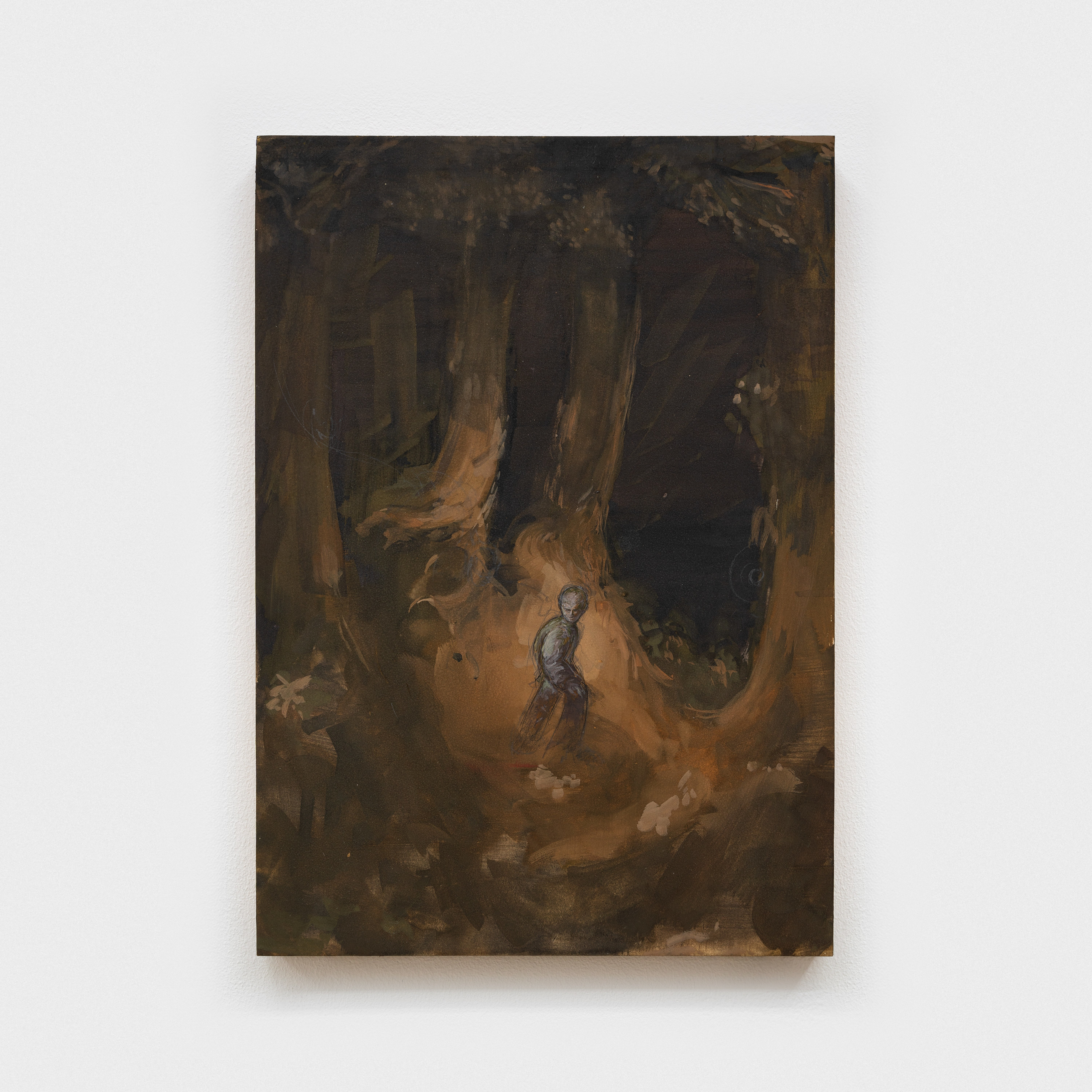 This dark, moody painting depicts a solitary figure navigating a dense, foreboding forest. The composition is dominated by earthy tones of brown and green, with the figure standing against a backdrop of towering, shadowy trees. The brushstrokes are expressive, lending a sense of motion and energy to the scene. The overall style suggests a Romantic or Symbolist influence, with the figure's isolation and the mysterious, enigmatic setting evoking a sense of the sublime in nature. This work likely explores themes of the human experience within the natural world and the search for meaning or self-discovery. ...