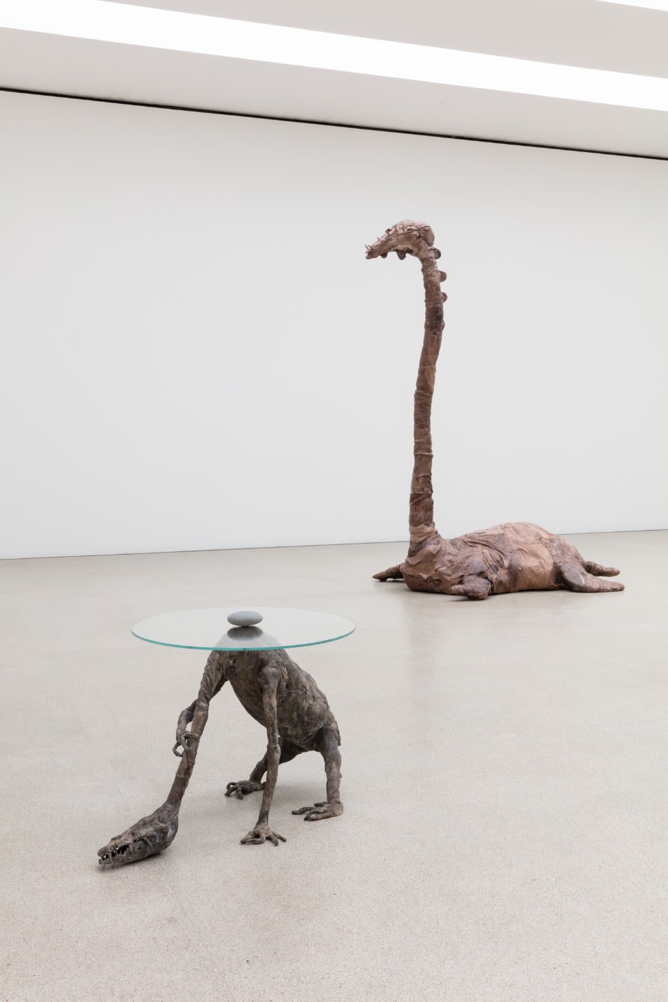The artwork features two sculptural pieces made of bronze and glass in a minimalist contemporary setting. The first piece depicts a whimsical, abstract figure with elongated limbs and a contorted pose, supporting a glass platform. The second sculpture presents a surreal, animal-like form with a stretched, bony neck and a reclined, reptilian body. The unusual, imaginative shapes and the combination of natural and artificial materials suggest an exploration of organic forms and human-made structures. The artist's intention may be to challenge conventional notions of form and function, inviting the viewer to contemplate the relationship between the natural and the artificial. ...