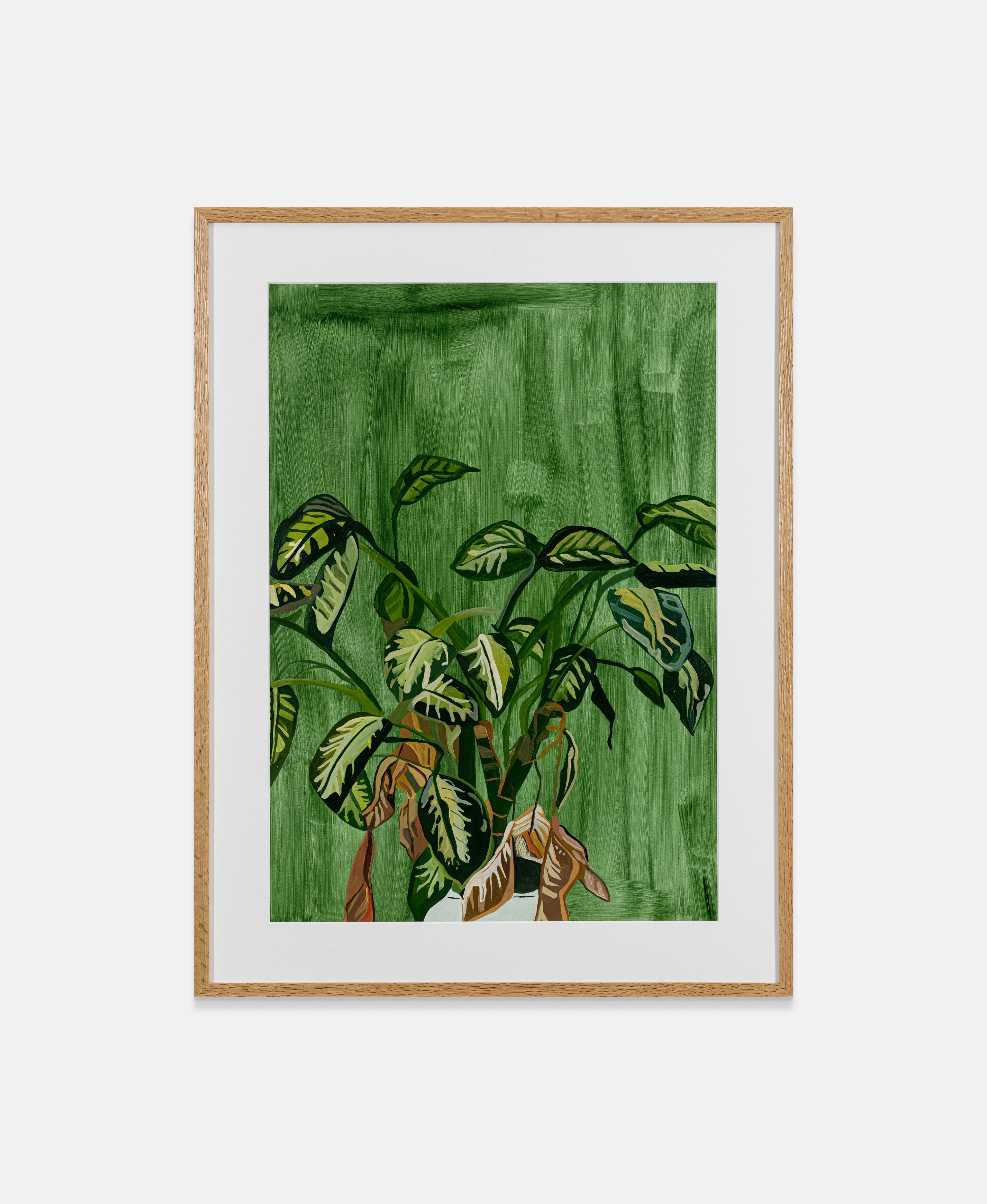 The artwork displays a vibrant and lush jungle scene rendered in bold brushstrokes of green hues. Prominent foliage with variegated leaves dominates the composition, creating a sense of dense, tropical vegetation. The overall style is expressionistic, with the artist using energetic brushwork to capture the dynamic nature of the plant forms. This artwork likely reflects the artist's fascination with the natural world and their desire to convey the verdant, untamed quality of a thriving, primordial landscape. ...