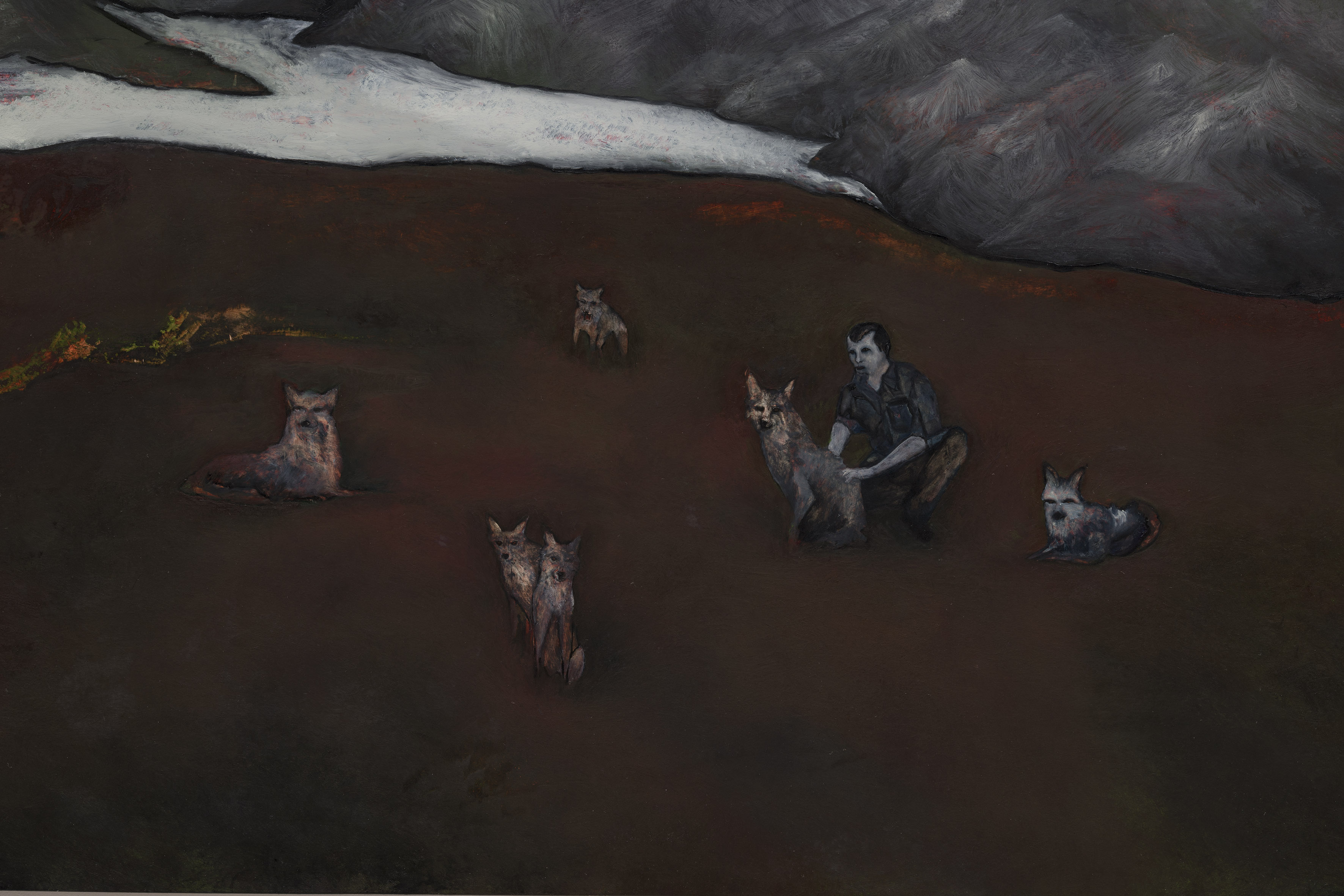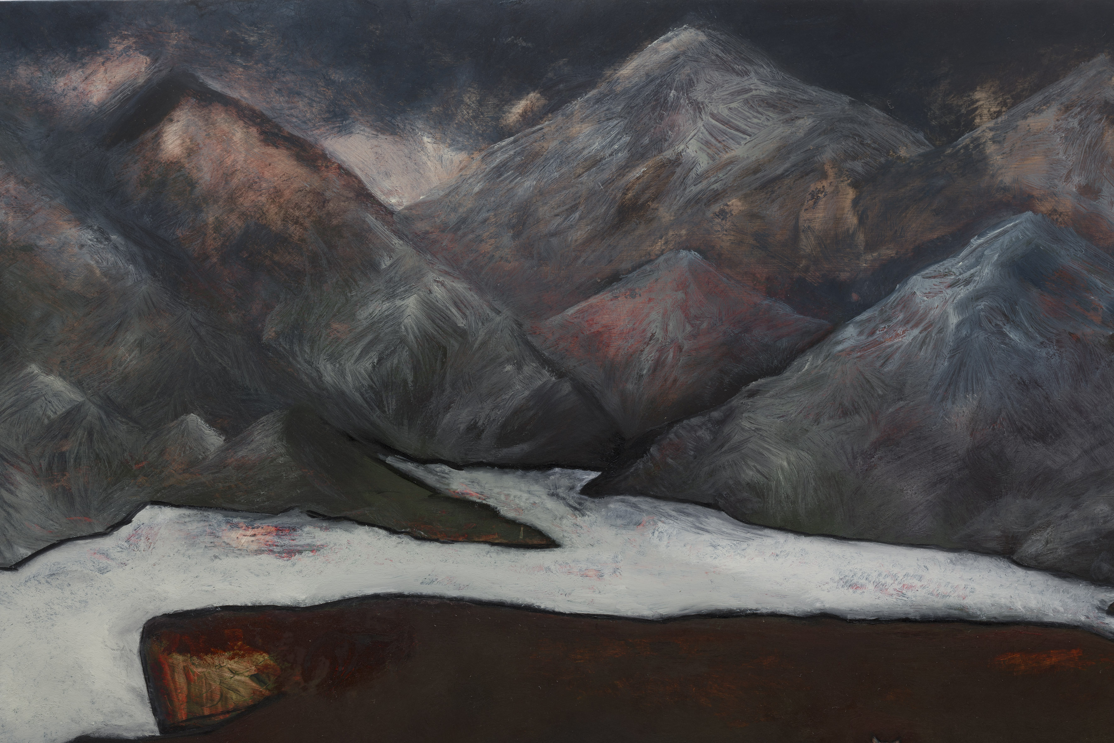 This vivid landscape painting depicts a dramatic mountainous scene shrouded in a moody, atmospheric haze. Shades of gray, brown, and blue dominate the color palette, with the mountains' rugged forms emerging from the mist. The brushwork is bold and expressive, creating a sense of movement and energy. The composition is balanced, with the mountains rising from a snowy foreground. This work evokes a sense of the sublime and the power of nature, reflecting the artist's vision of the grandeur and mystery of the natural world. ...