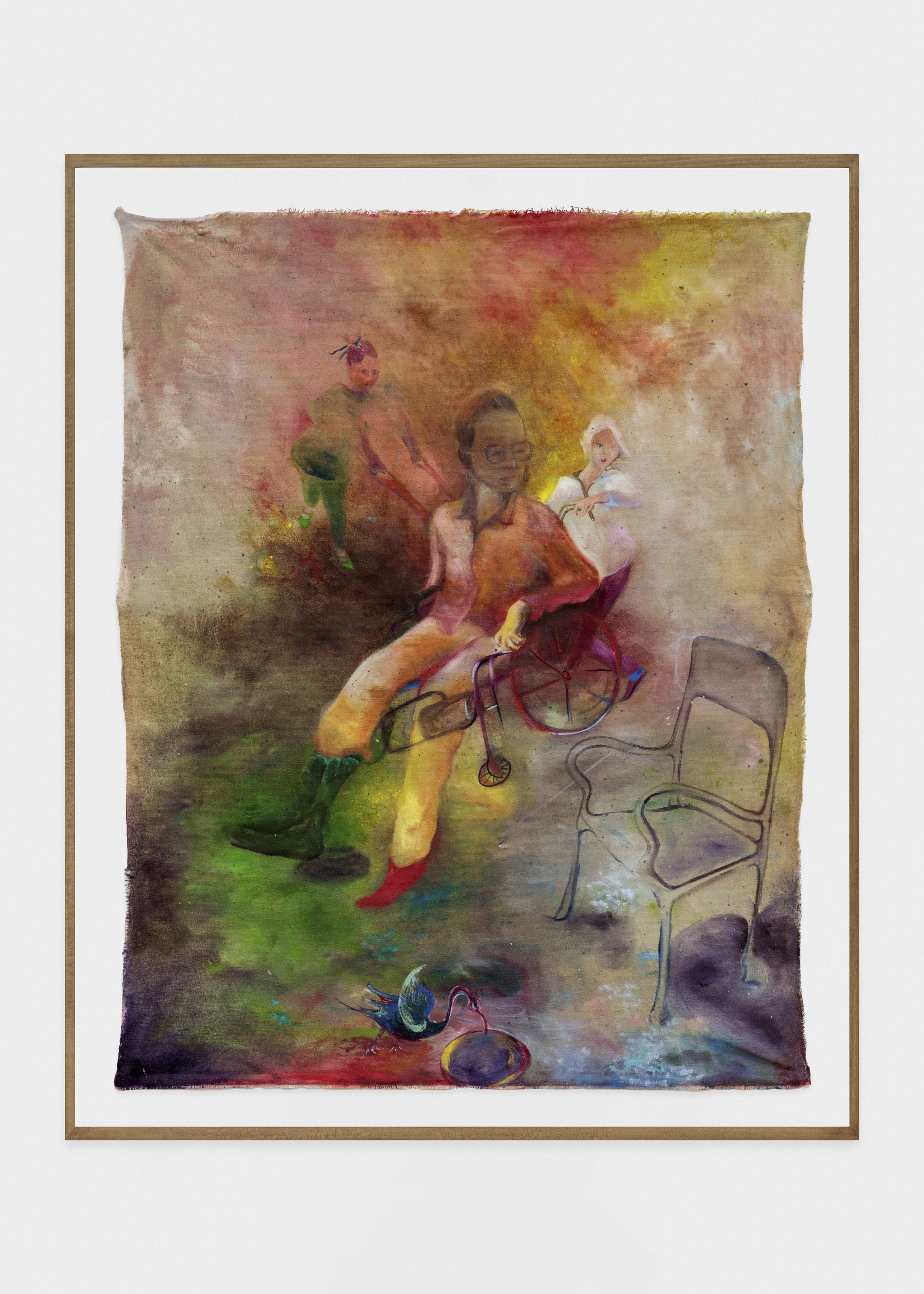 This abstract painting features a vibrant, dreamlike composition. The canvas is awash with a harmonious blend of warm hues, including reds, oranges, and yellows, creating a sense of energy and movement. Amidst the abstract shapes and forms, a stylized human figure in a wheelchair is depicted, evoking a narrative of disability and empowerment. The artwork's expressive, gestural brushwork and the integration of symbolic elements suggest a contemplation of the human condition and challenges faced by marginalized communities. The artist's intention appears to be a poetic exploration of identity, resilience, and the transformative power of art. ...