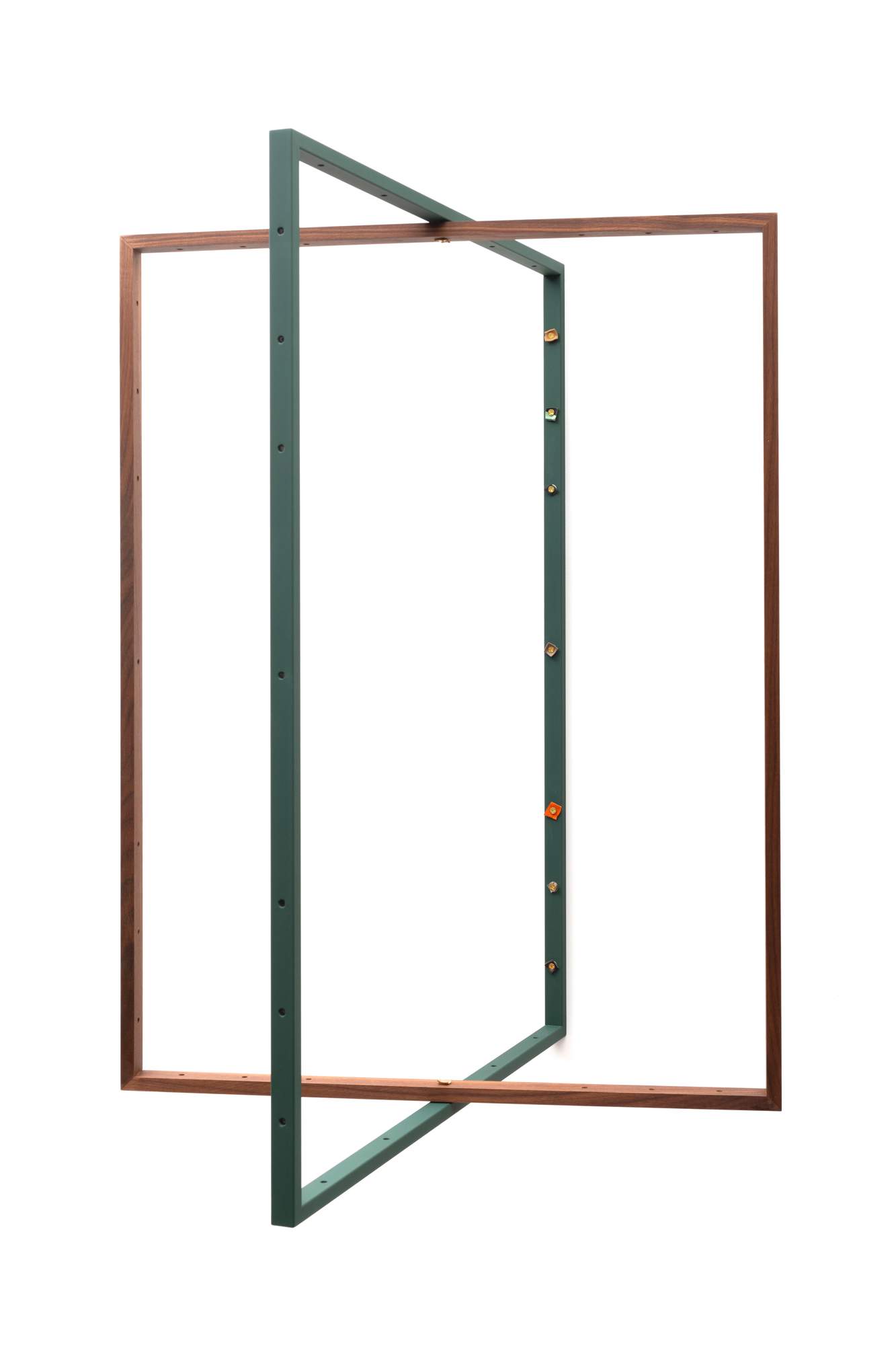 This contemporary sculptural artwork features a geometric frame composed of intersecting wooden and metal elements. The prominent rectangular structure is constructed with a warm-toned wooden frame, contrasted by the green-colored steel components. The overall composition emphasizes the interplay of different shapes, creating a visually striking and minimalist aesthetic. The artist likely intended to explore themes of balance, proportion, and the inherent tension between the natural and industrial materials used. This piece exemplifies the clean lines and reductive forms characteristic of modern abstract sculpture. ...