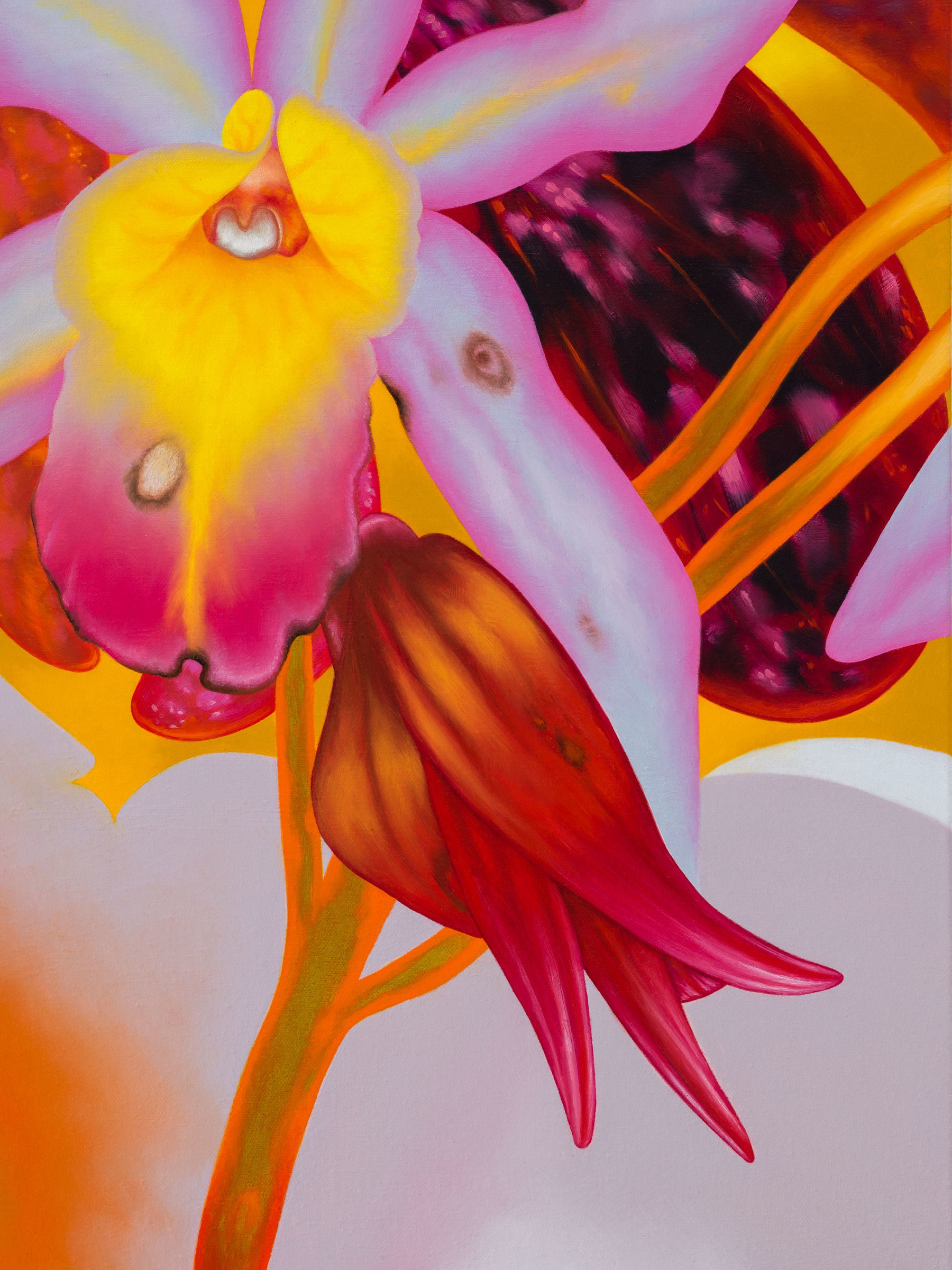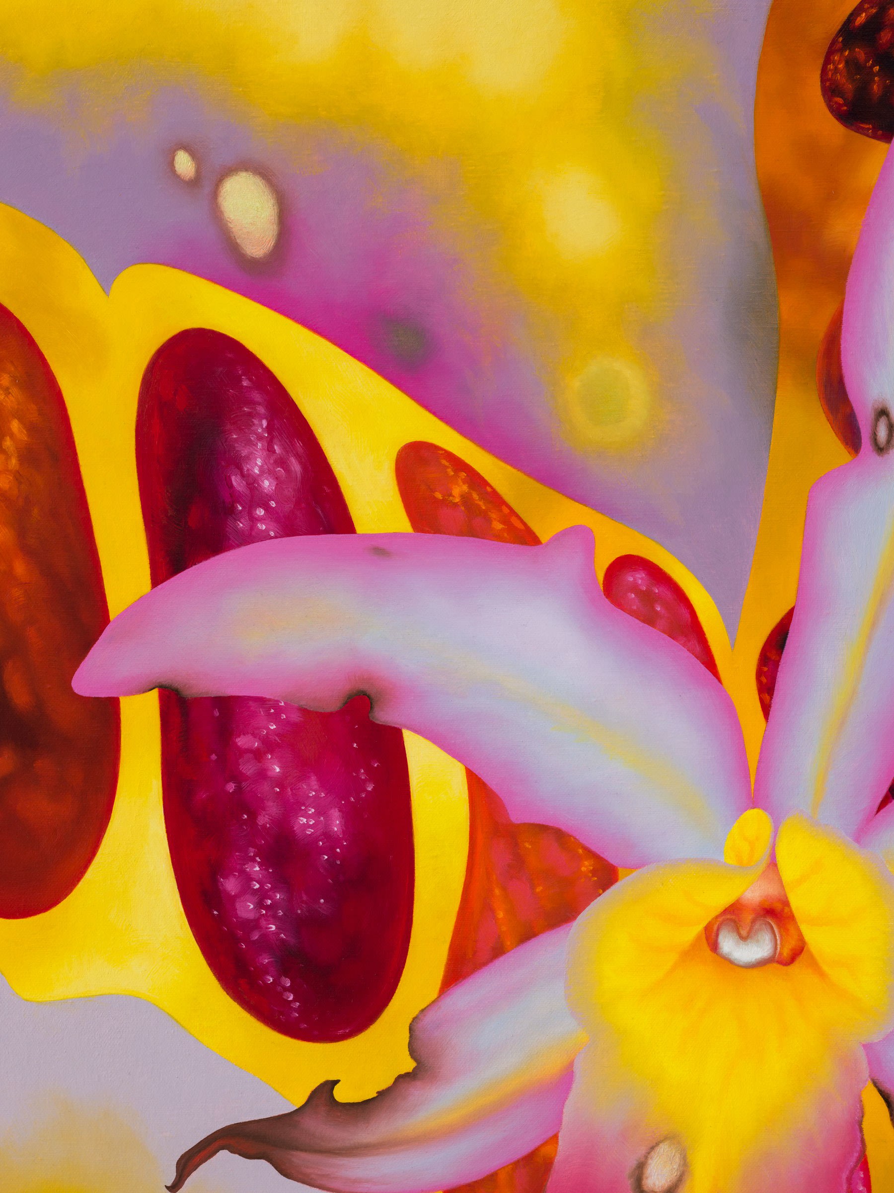 The artwork features a vibrant and bold close-up of a tropical orchid flower. The composition is dominated by a swirling palette of warm colors, including shades of yellow, orange, and red. The flower's delicate petals and intricate structure are captured in striking detail, creating a visually captivating and almost otherworldly effect. The distinctive style and technical mastery suggest this piece may be the work of a contemporary artist exploring the natural world through a highly stylized, almost surreal lens. The artist's intention may be to celebrate the intricate beauty and fragility of this floral specimen, inviting the viewer to appreciate the wonders of the natural world in a new and enchanting way. ...